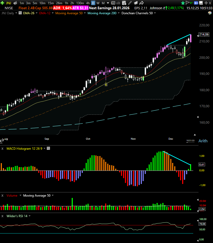The position was opened on Monday, December 15, after JNJ extended further into overbought territory while momentum began to flatten.
