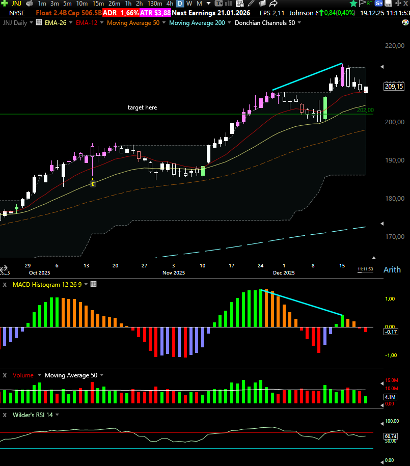 Johnson & Johnson (JNJ) continues to trade near recent highs after a strong multi-week advance. While price remains above key moving averages, momentum is no longer confirming the upside. On the daily chart, MACD histogram is printing a clear bearish divergence versus price — a classic signal of internal exhaustion rather than trend acceleration.