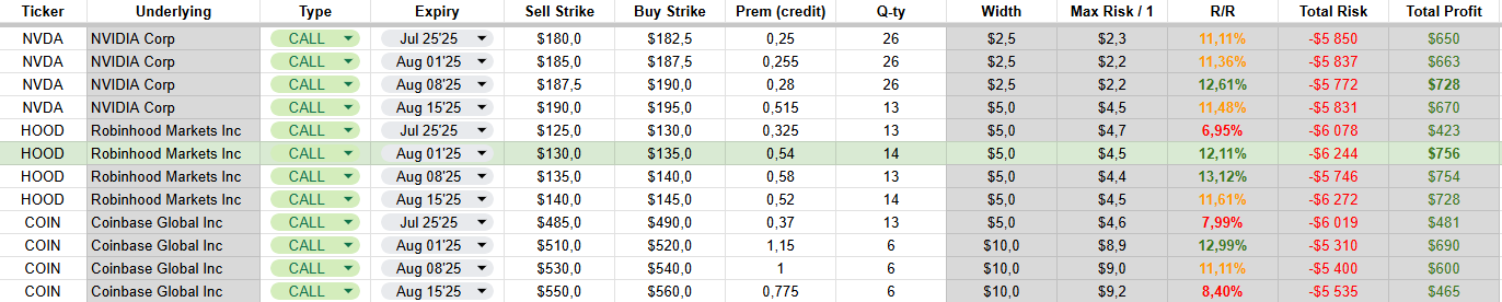 Built a Google Sheets model to evaluate credit spreads across NVDA, COIN, and HOOD — all structured with the same maximum risk.