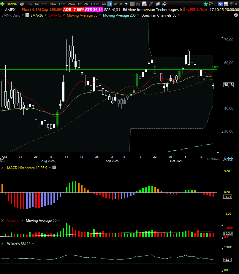 The daily chart shows BMNR consolidating after the summer blowout move. Price is holding above the $50 support zone, with clear higher lows forming over the past weeks.