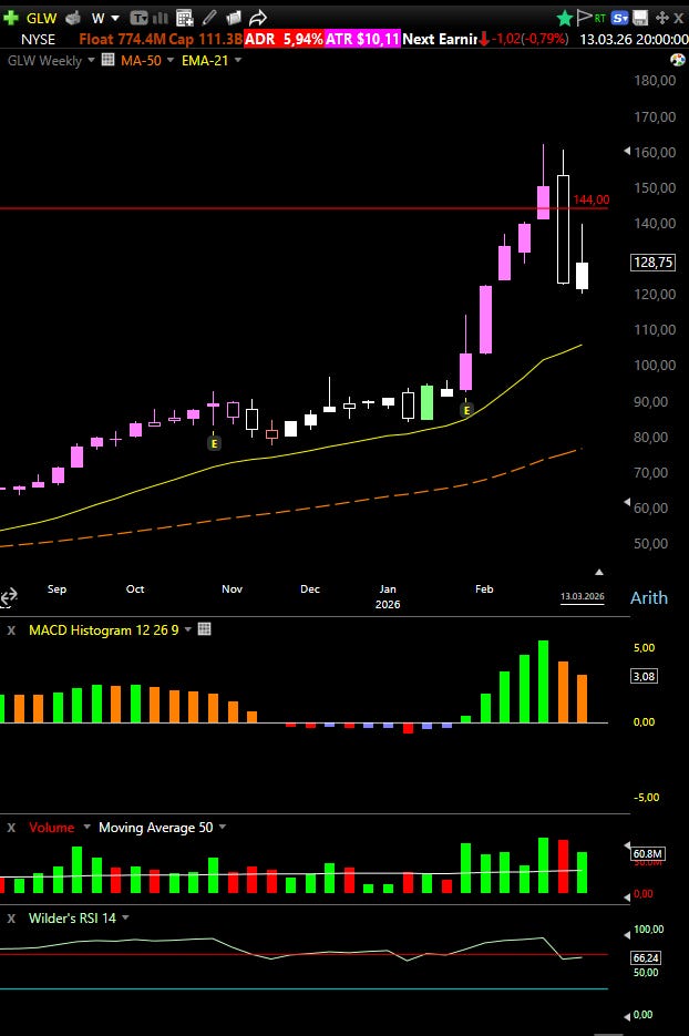 β GLW had experienced a persistent multi-week advance, pushing price well above the EMA cluster on the weekly timeframe.