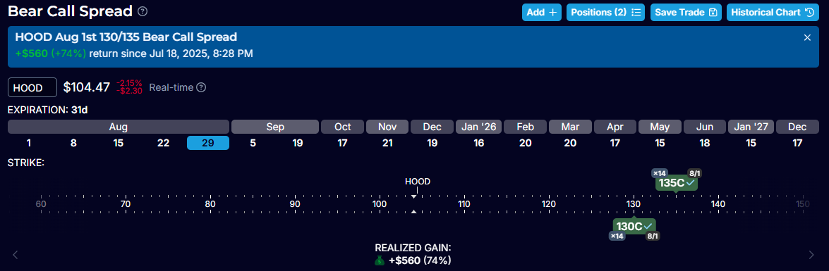 HOOD β 130/135 Call Credit Spread (Exp. Aug 1st)