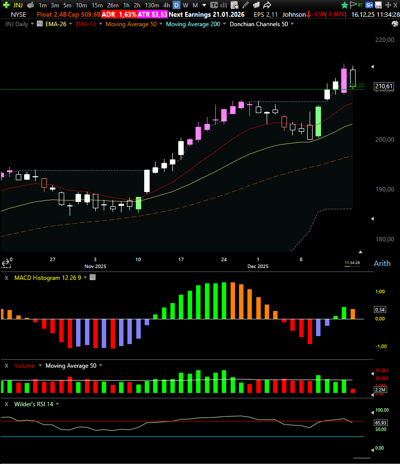 JNJ pulled back sharply on Tuesday, dropping toward the 210 area after trading in clearly overextended territory. That move was enough for the spread to decay rapidly, allowing me to exit early and lock in my predefined weekly target.